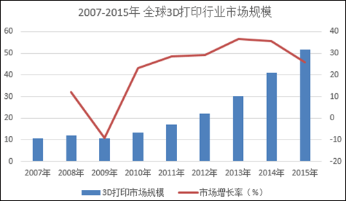 有數(shù)據(jù)顯示,2010年-2014年3D打印的年復(fù)合增長率達(dá)到30.9%;2014年,全球3D打印產(chǎn)品和服務(wù)產(chǎn)值已經(jīng)達(dá)到41.03億美元,同比增長35.2%,實現(xiàn)了18年以來的最快增速。2015年,全球增材制造和3D打印市場銷售額達(dá)到51.65億美元,與2014年相比增長了10億美元出頭,增長率達(dá)到25.9%。