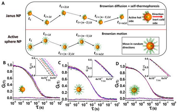 作者系統(tǒng)研究這種自熱泳納米馬達(dá)的運(yùn)動(dòng)方向、驅(qū)動(dòng)力與化學(xué)反應(yīng)熱之間的關(guān)系。從描述布朗顆粒運(yùn)動(dòng)的郎之萬(wàn)方程出發(fā),建立納米馬達(dá)擴(kuò)散運(yùn)動(dòng)的隨機(jī)模型,推導(dǎo)出納米馬達(dá)擴(kuò)散系數(shù)與化學(xué)反應(yīng)速度之間的關(guān)系。