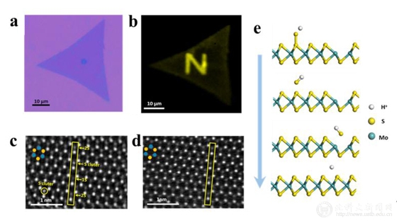 圖2(a)氣相沉積法生長的單層MoS2的形貌,(b)采用自修復工藝在MoS2中選區(qū)修復字母N形狀,該圖為光致發(fā)光譜表征結果,(c)和(d)分別為自修復前后MoS2的結構表征,可以明顯看出修復后結構中的缺陷減少,(e)MoS2缺陷自修復過程的示意圖。