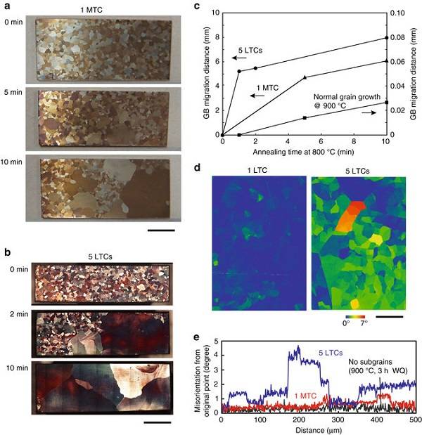 b.多次低溫循環(huán)熱處理(740/500℃)后,由于亞晶粒之間取向差增大,因此亞晶界能升高,晶界遷移速率增大,為超大晶粒的實現(xiàn)提供可能