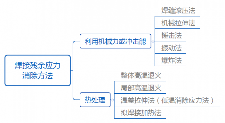 殘余應(yīng)力的消除方法可分為機(jī)械作用方法和熱作用方法。機(jī)械的方法是利用外力使材料內(nèi)產(chǎn)生塑性變形來(lái)達(dá)到降低殘余應(yīng)力的目的。理論上講,只要外力使性質(zhì)均勻的構(gòu)件整體同時(shí)達(dá)到屈服,全部消除殘余應(yīng)力是可能的。但實(shí)際上由于種種困難,用這種方法想把應(yīng)力完全消除是難以實(shí)現(xiàn)的。用熱作用消除殘余應(yīng)力與蠕變和應(yīng)力松弛現(xiàn)象有密切關(guān)系。用熱作用去除殘余應(yīng)力時(shí),只要退火溫度和保溫時(shí)間適宜,應(yīng)力是完全可以消除的,但與此同時(shí)卻會(huì)造成材料硬度和其他機(jī)械性能下降,并且因熱作用而產(chǎn)生的組織變化也是不可避免的。焊接殘余應(yīng)力消除方法總結(jié)如圖7所示。