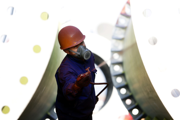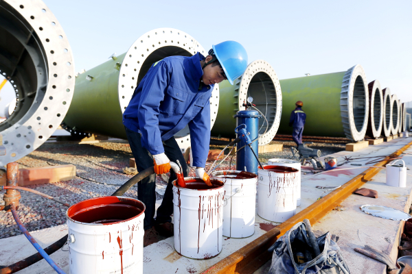 在舟山500千伏聯(lián)網(wǎng)工程現(xiàn)場(chǎng),十余名工作人員正在為地面堆放整齊的一根根鐵塔桿管噴刷“石墨烯改性重防腐涂料”,為這座在建的世界最高鐵塔穿上一身“防腐外套”。