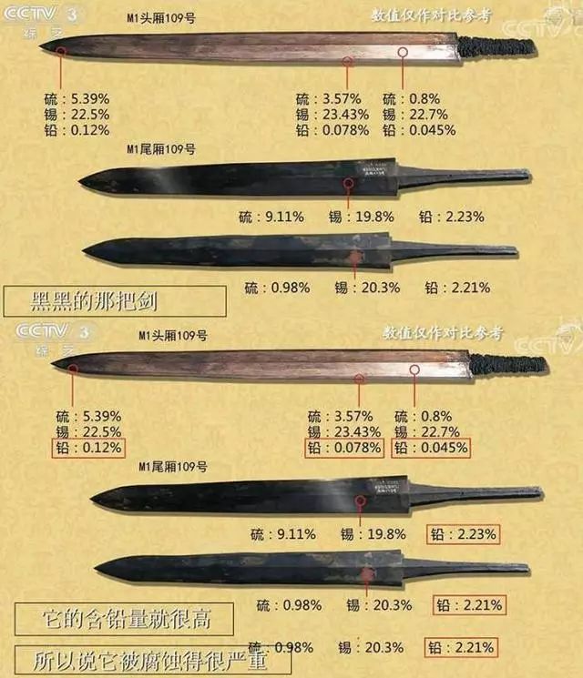 春秋戰(zhàn)國時(shí)期青銅劍的合金組成中,銅與錫的含量依制作的年代、地點(diǎn)、原料來源、工藝的不同而不同,一般說來,銅的含量在70%-80%或稍高、錫的含量在10%-20%左右,此外,合金中常常還含有鉛、鐵等其它成分。
