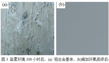 鋁合金的防腐蝕方法有很多,其中最常用的措施是施加防腐涂料,將鋁合金基體與外部環(huán)境進(jìn)行有效的隔離。由于服役的環(huán)境條件存在差異,例如干燥風(fēng)沙環(huán)境、沿海潮濕海洋氣氛環(huán)境、工業(yè)酸雨環(huán)境等等,不同環(huán)境條件下材料的損傷速度顯著不同,對(duì)材料的要求存在明顯差異。典型的防腐涂料為環(huán)氧樹脂類底漆,具有耐水性好、對(duì)基體附著力強(qiáng)、與多種涂料配套性好等優(yōu)點(diǎn)而得到廣泛應(yīng)用,例如美國(guó)海軍在鋁殼艇中使用的就是雙組分的環(huán)氧底漆。圖為施加環(huán)氧底漆前后鋁合金在鹽霧環(huán)境浸泡100小時(shí)后形貌比較。可見使用涂料后起到了較好的耐蝕效果。我國(guó)研發(fā)出了先進(jìn)的納米復(fù)合涂料技術(shù),經(jīng)過(guò)評(píng)定優(yōu)于現(xiàn)役涂層,特別是能適應(yīng)不同的地域環(huán)境,有待盡快推廣應(yīng)用。