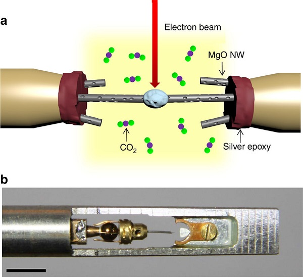 中國(guó)石油大學(xué)(北京)李永峰教授、西安交通大學(xué)單智偉教授和燕山大學(xué)黃建宇教授(共同通訊作者)在Nature Communications上發(fā)表最新研究成果“Ceramic nanowelding”。本項(xiàng)實(shí)驗(yàn)研究中,研究人員介紹了一種用于陶瓷納米線焊接的技術(shù)。采用該連接技術(shù)得到的接頭力學(xué)性能比原始納米線的性能還要好。在CO2氛圍下,借助先進(jìn)的球差環(huán)境透射電子顯微鏡(ETEM),以多孔MgO為釬料,通過(guò)化學(xué)反應(yīng)MgO + CO2 → MgCO3實(shí)現(xiàn)了陶瓷的連接。該技術(shù)不僅能夠?qū)崿F(xiàn)MgO,CuO和V2O5 納米線的連接,并進(jìn)行了拉伸實(shí)驗(yàn),而且可以連接宏觀的陶瓷材料SiO2,這也意味著該技術(shù)未來(lái)可能用在陶瓷工具和器件上。