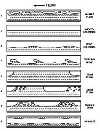 多相流指的是在管道內(nèi)油、水、氣等介質(zhì)混合在一起并傳輸?shù)臓顟B(tài)。在水平管道中,可以看到如下圖所示的幾種流體形態(tài)。流態(tài)主要取決于液體與氣體的流速以及混合比率。